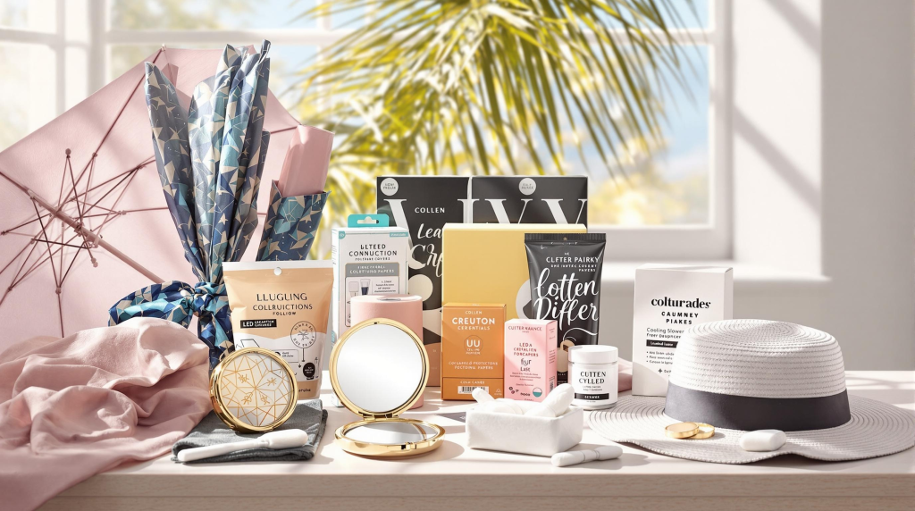 女性向けの夏の販促品として特に注目を集めているのが、美容と実用性を兼ね備えたUVケアアイテムです。特に最近のトレンドは、ファッショナブルなデザインの日傘や、冷感機能付きのアームカバー、コンパクトに折りたためる帽子など、おしゃれ心をくすぐりながら確実な紫外線対策ができる商品群です。