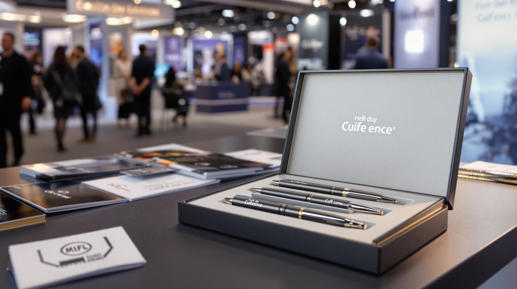 名入れボールペンのセットは、展示会やビジネスイベントでの配布に最適です。