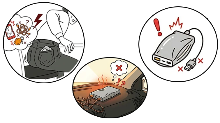 - 衝撃・加圧: ズボンの後ろポケットに入れたまま座る、重い荷物の下敷きにするなどの圧迫は、内部短絡の引き金になります。