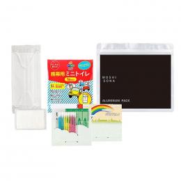 • 商品サイズ:ポーチ/220×150(mm) 携帯トイレ/132×275(mm) ごみ袋/500×600(mm) 圧縮タオル/広げた時:約240×250(mm) マスク/約165×95(mm) 防災ガイド/70×105(mm)