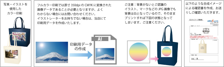 熱転写などのカラー印刷でも印刷にイラストレーターによるデータが必要となりますが、写真やイラストを特に加工なしでそのまま印刷したいという場合であれば、それらを埋め込み画像とした印刷用のデータを作成することができます。