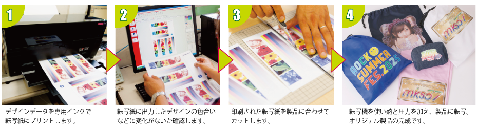 昇華転写印刷は、ポリエステル素材に特化した転写印刷方法で、多様な製品に発色の良い、美しいカラー印刷ができます。