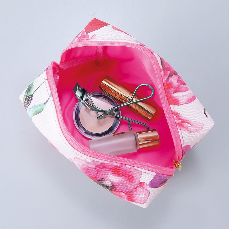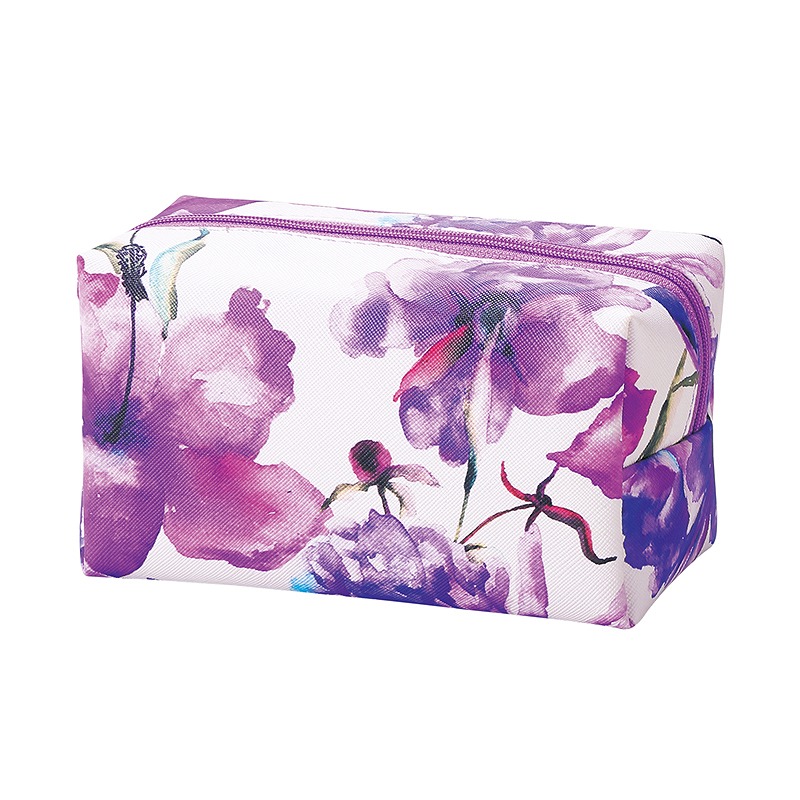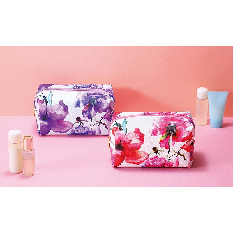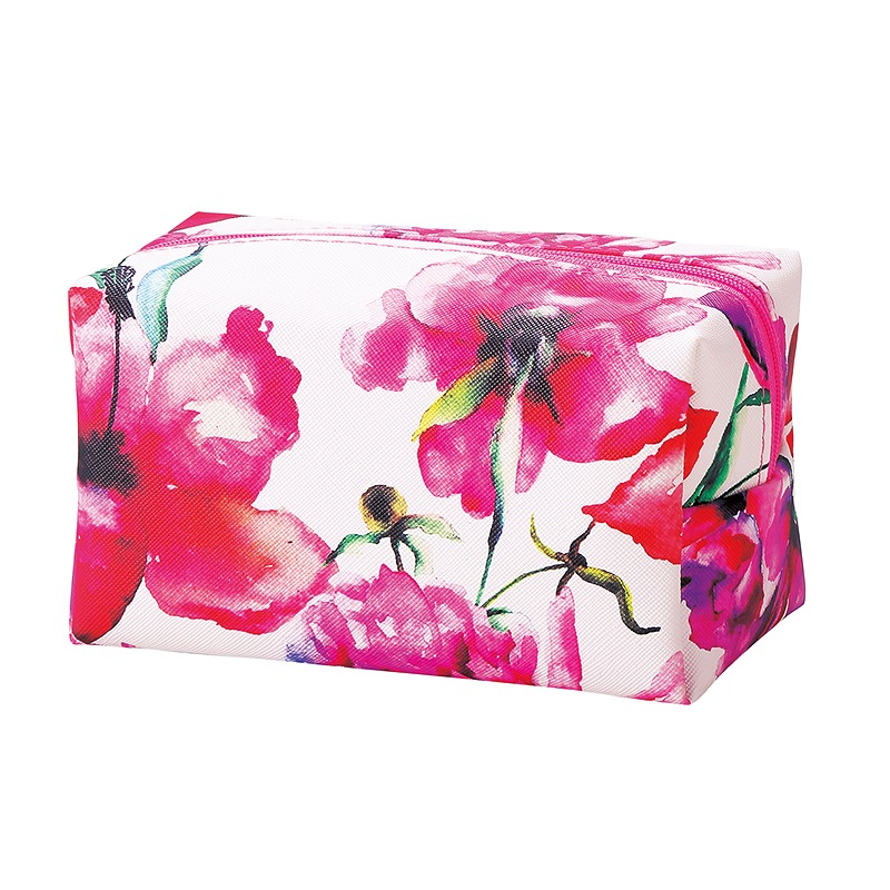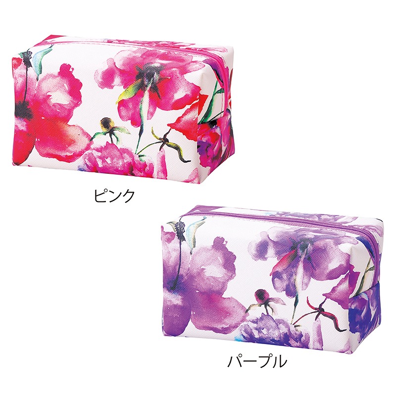 大胆な花柄プリントが目を引く、収納力抜群のボックス型ポーチです。