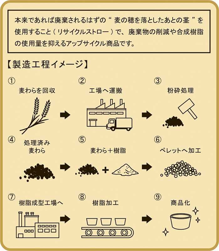 麦の穂を落とした後の茎を再利用することで、廃棄物や合成樹脂の使用量を削減しています。軽くて割れないのでお子様がいても安心。サラダやシリアル、フルーツなど何にでも使える使い勝手の良さが魅力です。 ※天然素材配合のため、色に多少のばらつきが生じます。 ※電子レンジ・オーブン使用不可