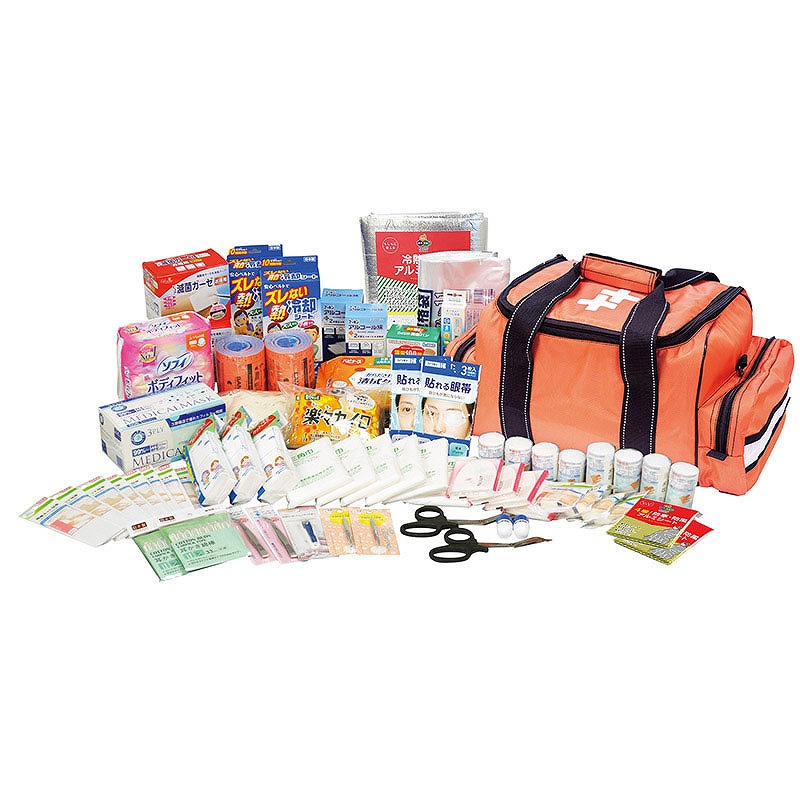セット内容:(1)救急バッグ(大)、(2)伸縮ネット包帯2.3号(指用×1・ひじ用×1)×4、(3)伸縮ネット包帯4号(手足用×1)×4、(4)ソフト包帯75mm巾×4、(5)ソフト包帯50mm巾×4、(6)サージカルテープ×4、(7)耳かき綿棒×2、(8)アルコール綿1箱(60包入)×2、(9)滅菌済ガーゼ1箱(8枚×3)×2、(10)三角巾×6、(11)ズレない!熱冷却シート1箱(2枚×6)×2、(12)貼れる眼帯(3枚入)×2、(13)カワモトF80カット綿(5×6)×3、(14)救急絆創膏(100枚入)、(15)3PLYマスク(1箱)、(16)ピジョンからださわやか清拭タオル30枚入、(17)ポケットティッシュ×4、(18)ゴム手袋(1枚)×24、(19)CITIZEN電子体温計、(20)ステンレスはさみ×2、 ピンセット(先曲りタイプ)×2、 爪切り、 ステンレス毛抜き×2、 4層!防寒・防風アルミシート×2、 オンパックス備蓄用(10枚入り)、 ポリ袋(小)透明×100、 サムスプリント×2、 カプシー×2、 エリス新・素肌感(1パック)、 冷熱遮断アルミシート