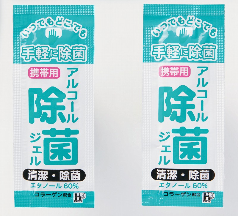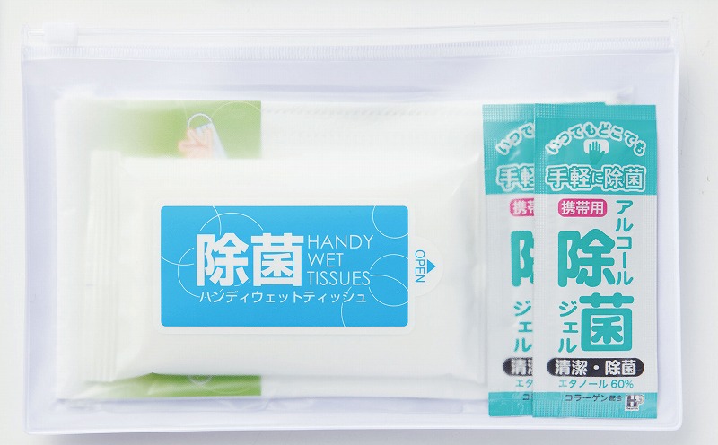 携帯用しやすいファスナーポーチと除菌グッズをセット。