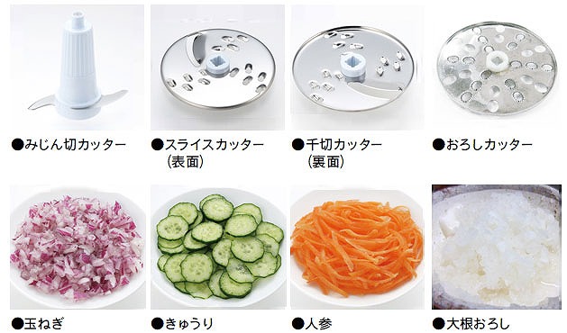 本体:ABS樹脂、容器:AS樹脂、カッター(みじん切):ステンレス鋼・ABS樹脂、カッター(スライス・千切・おろし):ステンレス鋼・ABS樹脂、回転軸:ABS樹脂、押し込み棒:ポリプロピレン、コードの長さ:約1.6m、取扱説明書(保証書付)、(連続使用2分以内)100V/80W、50/60Hz