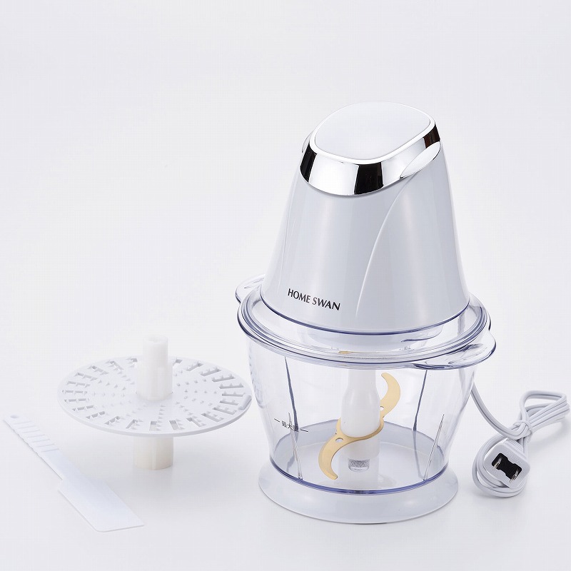 本体(樹脂部):ABS樹脂、本体底部(樹脂部):ポリプロピレン、カップ・カップふた:AS樹脂、カップふたパッキン:シリコーンゴム、回転刃:ステンレス(チタンコーティング)、コードの長さ:1.0m、AC100V/250W、付属品:スパチュラー・大根おろし用アタッチメント