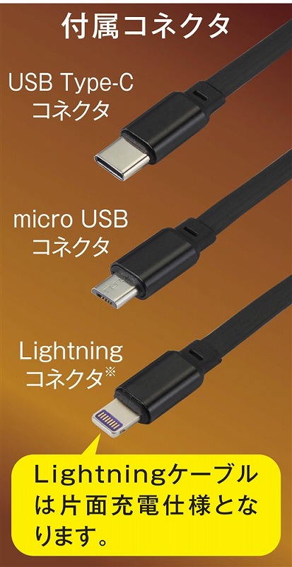 [付属ケーブル] ・USBコネクタ(給電用) ・USB Type-Cコネクタ ・micro USBコネクタ ・Lightningコネクタ ※充電のみ(データ転送不可) ※複数台同時充電不可