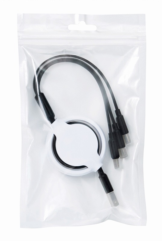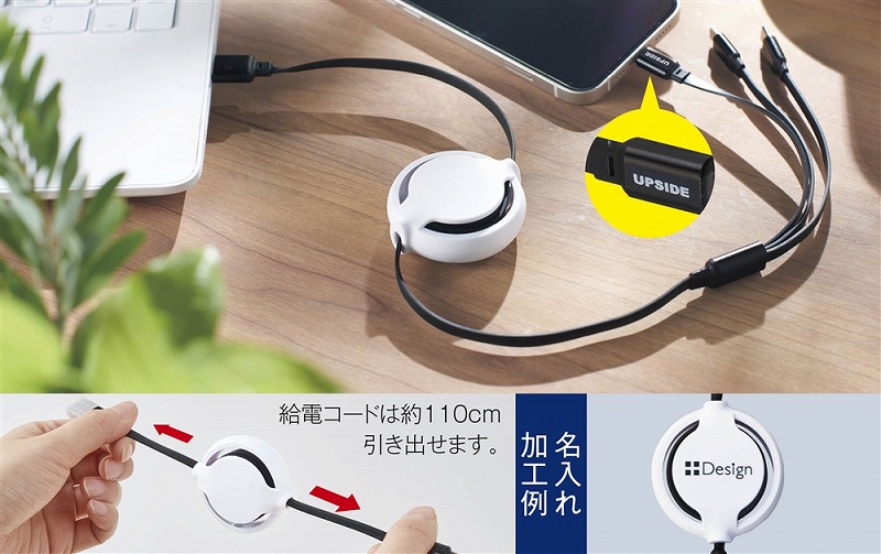 白地の天面に名入れも可能。透明ジッパーバッグ入りなので名入れアピールもバッチリです。 給電コードは約110cmまで引き出せます。※Lightningケーブルは片面充電仕様です。