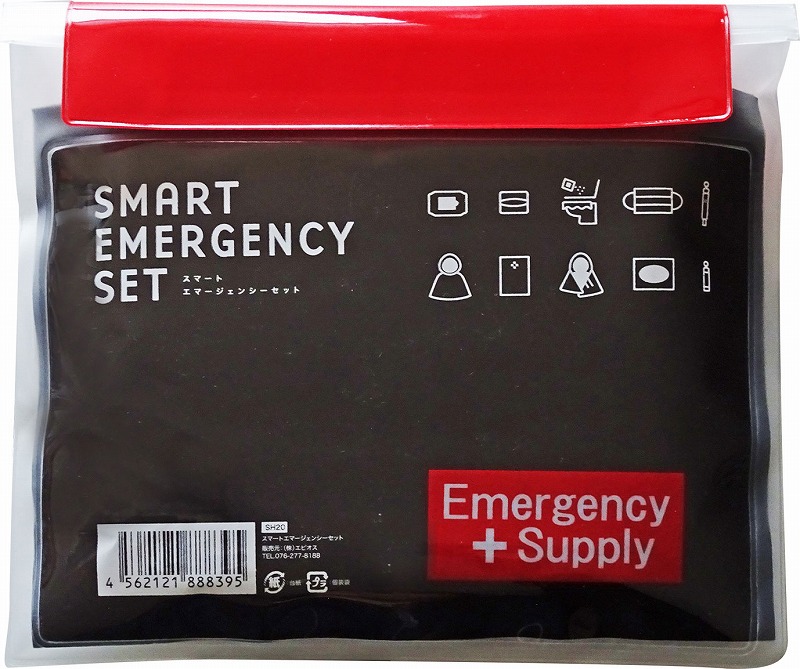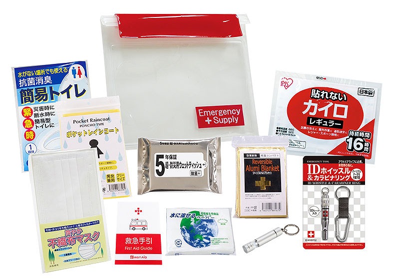 防水ポーチ・IDホイッスル&カラビナリング・マスク・ウェットティッシュ・リバーシブルアルミブランケット・LEDライト・カイロ・レインコート・水に流せるペーパー・抗菌消臭簡易トイレ・救急手引