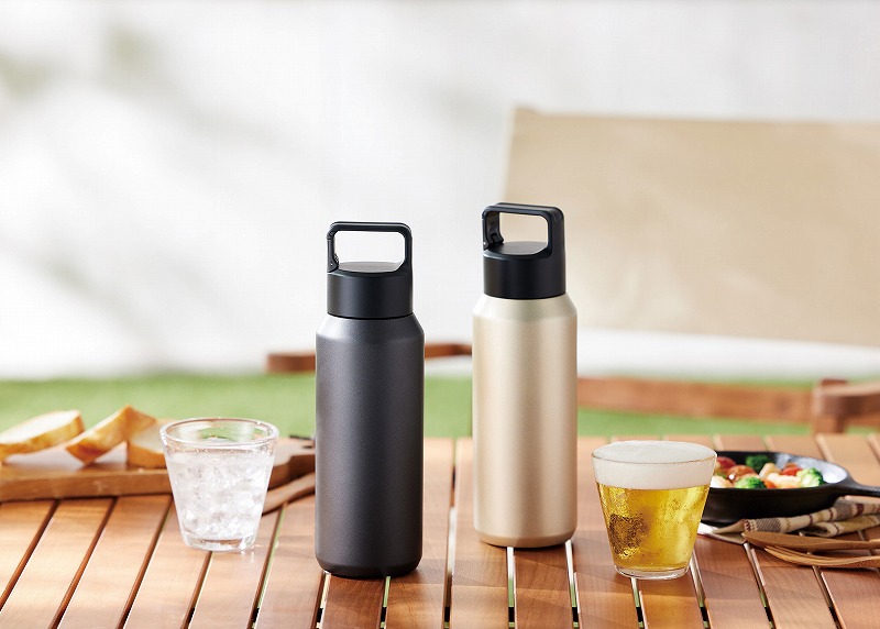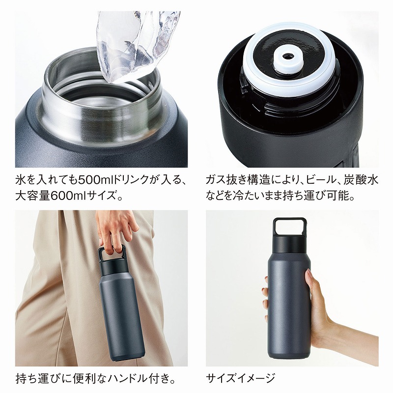 炭酸飲料を冷たいまま持ち運べる、真空2重構造のステンレスボトル。