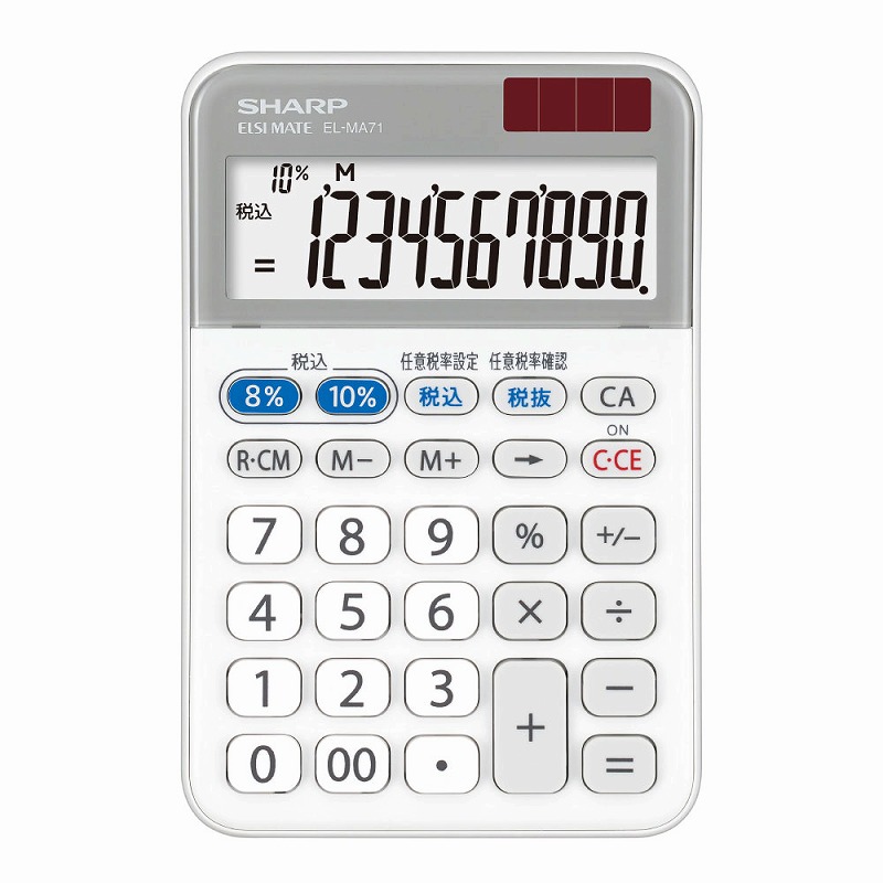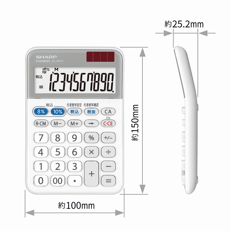 計算機能:加減乗除、定数計算、メモリー計算、パーセント計算、べき乗計算、逆数計算、税計算(8%、10%、任意)