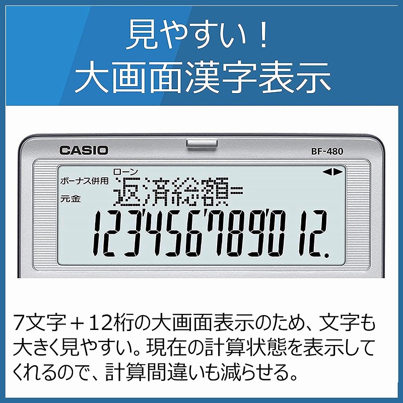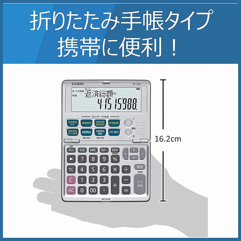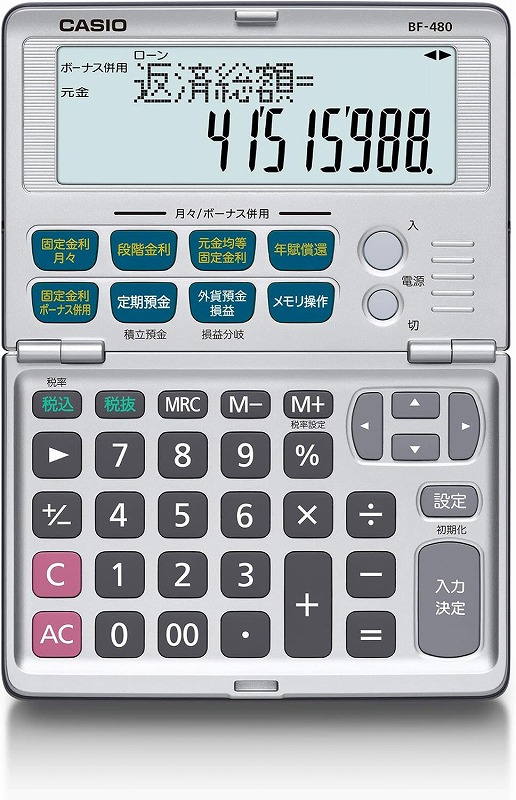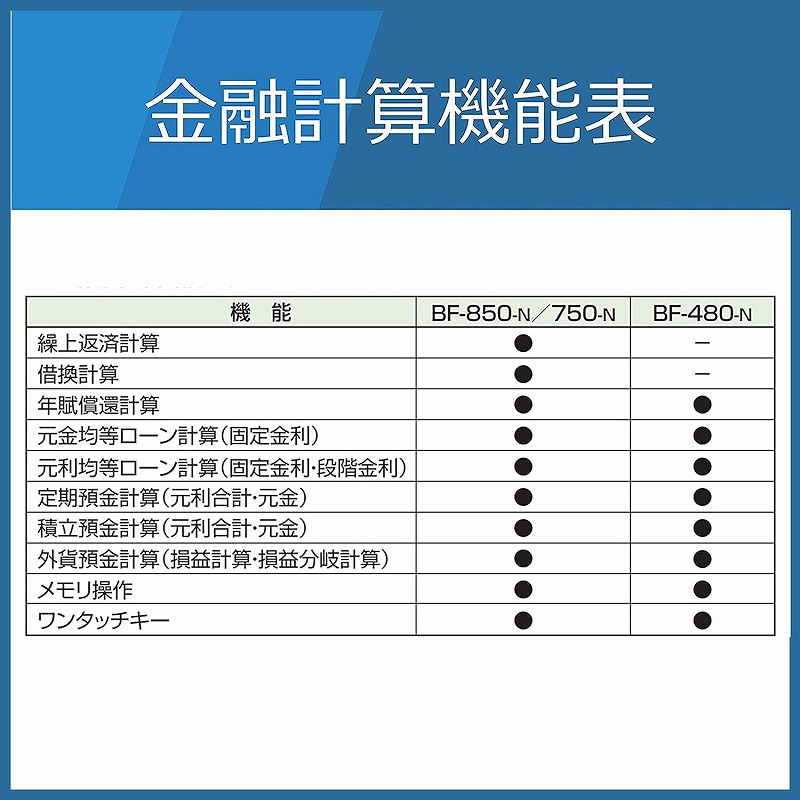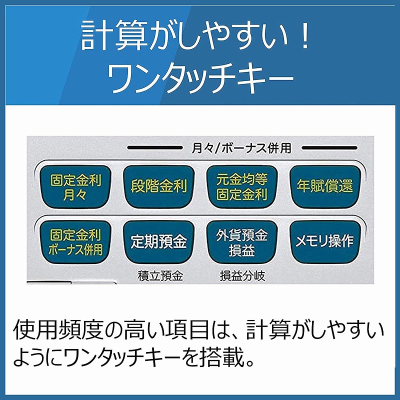 段階金利計算(通常月々・ボーナス併用)、ローン計算(通常月々・ボーナス併用)、定期預金計算(元利合計・元金)、積立預金計算(元利合計・元金)、外貨預金計算機能(損益計算・損益分岐計算)、元金均等計算、年賦償還機能