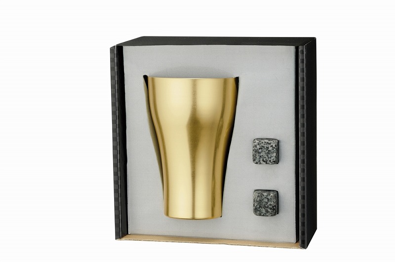 高級感漂うゴールドのアルミタンブラーとアイスストーンのセット。豪華な化粧箱に収められ、周年祝いや退職祝い、各種お祝いの贈り物にぴったり。タンブラーは軽量で頑丈、アイスストーンは飲み物を薄めずに冷やすのに便利な大理石製。洗って繰り返し使えるエコなアイテム。アイスストーンは冷凍庫で12時間冷やしてからご使用ください。