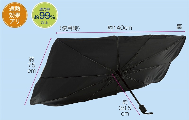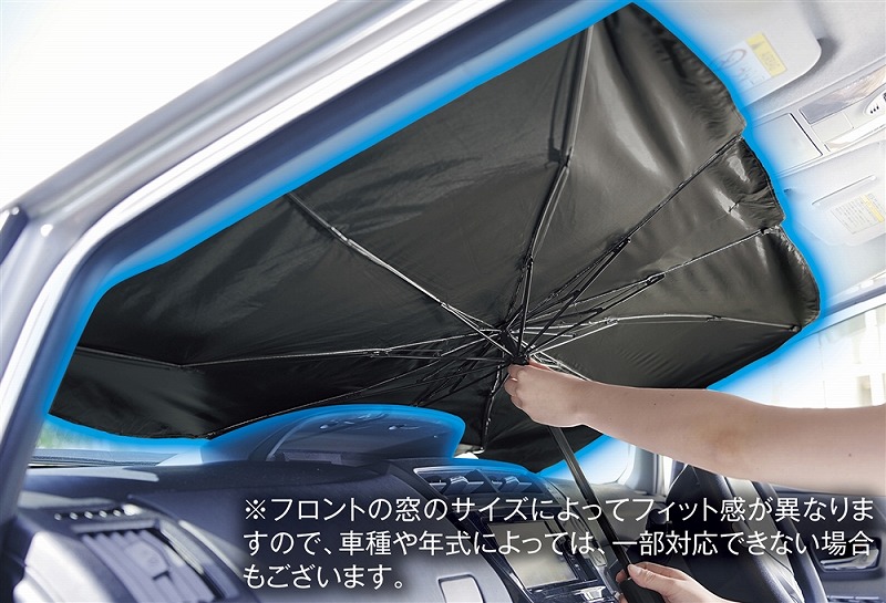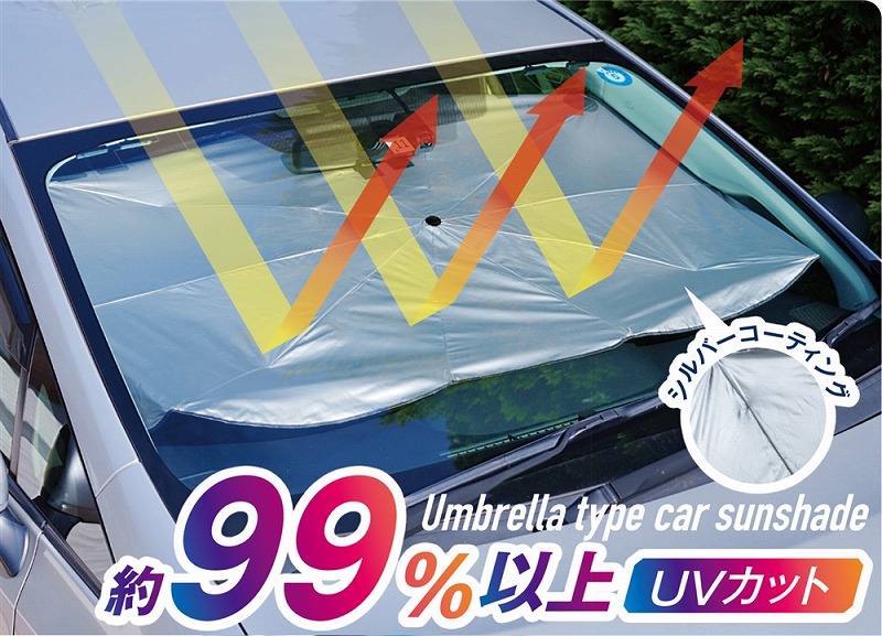 99%以上UVカット(遮熱効果あり)。フロントガラスに吸盤の跡などが付かない傘タイプ。※フロントガラスのサイズによってフィット感が異なりますので、車種や年式によっては一部対応できない場合もございます。※この製品1個あたり、CO2排出量が2kgオフセットされます。