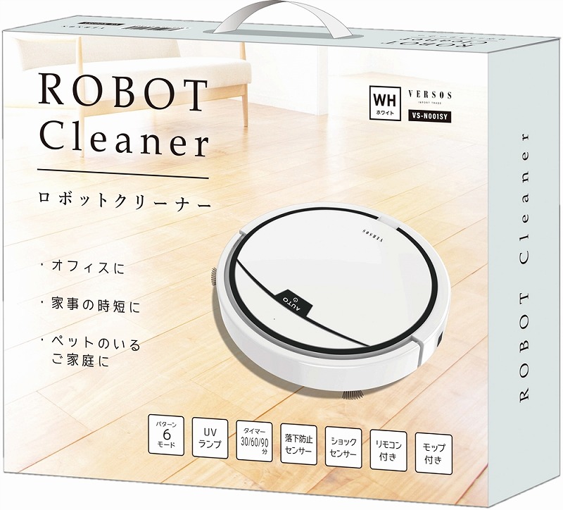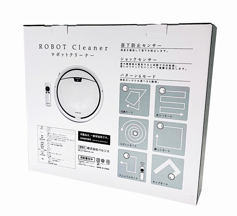 ・段差を感知して落下を防止する「落下防止センサー」搭載。 ・壁や障害物を感知すると自動で方向転換する「ショックセンサー」搭載。壁にぶつかってもバンパーで衝撃を吸収します。 ・底面に除菌用UVランプ2灯付き ・タイマー(30/60/90分)機能付き ・リモコン付き ・モップ付き