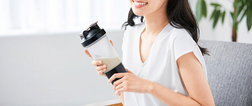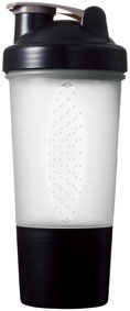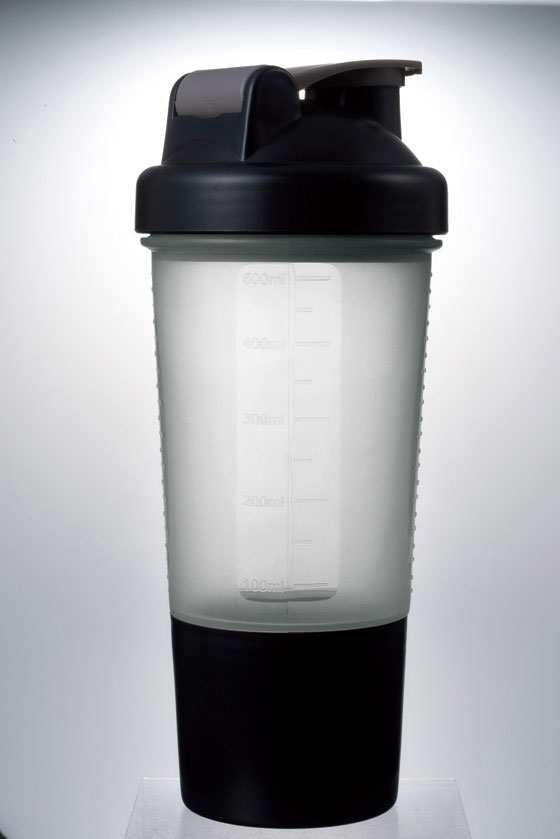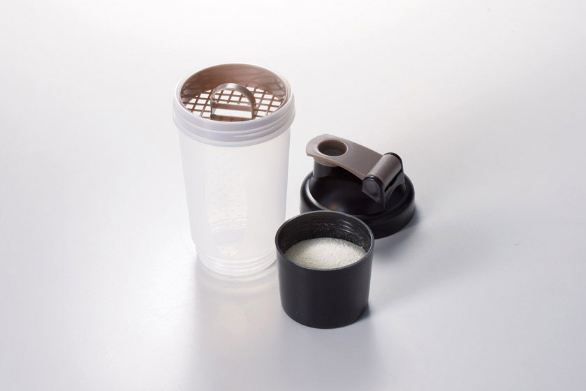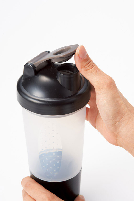 プロテイン等、粉末ドリンクが入れられる カップ付のシェイカーボトルです。 ボトル表面は滑りにくい凸加工がされています。