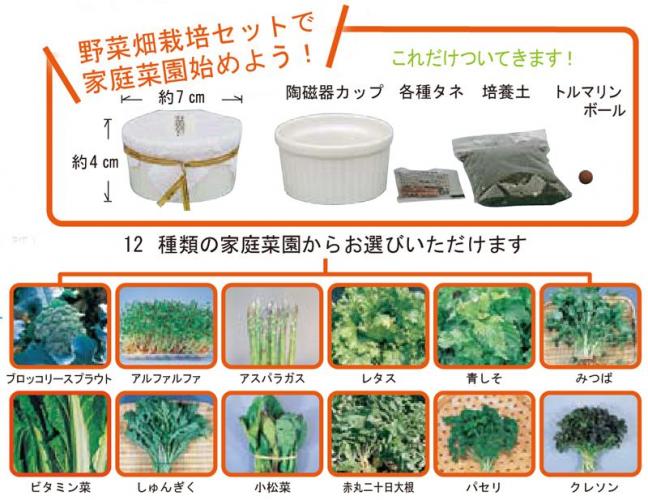 12種類(ブロッコリースプラウト・アルファルファ・アスパラガス・レタス・青シソ・みつば・ビタミン葉・しゅんぎく・小松菜・赤丸二十日大根・パセリ・クレソン)から1つお選びになり、コメント欄にご記入ください。