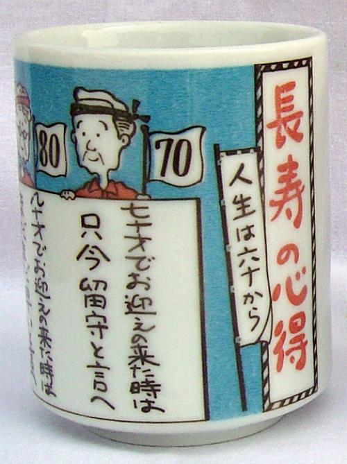 健康・長寿の秘訣・格言・プチ知識などがユーモラスに描かれた湯呑です。開店のご挨拶、快気祝い、長寿のお祝いなどいろいろな場面のノベルティとしてご利用ください