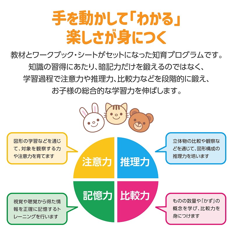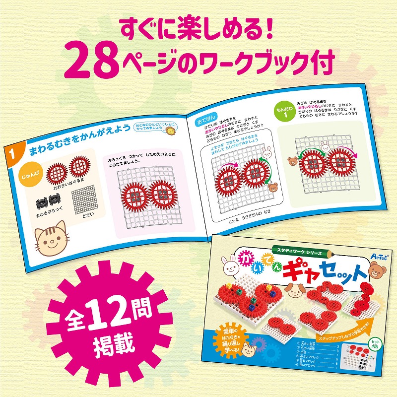 ギヤ30(φ64×10mm)×3、ギヤ20(φ44×10mm)×3、回転軸C(20×20×21mm)×6、ステー(100×20×10mm)×1、ミニ四角(青・黄・緑)×各2、12ベース(120×120×10mm)×1、ワークシート(A5サイズ/16ページ)×1