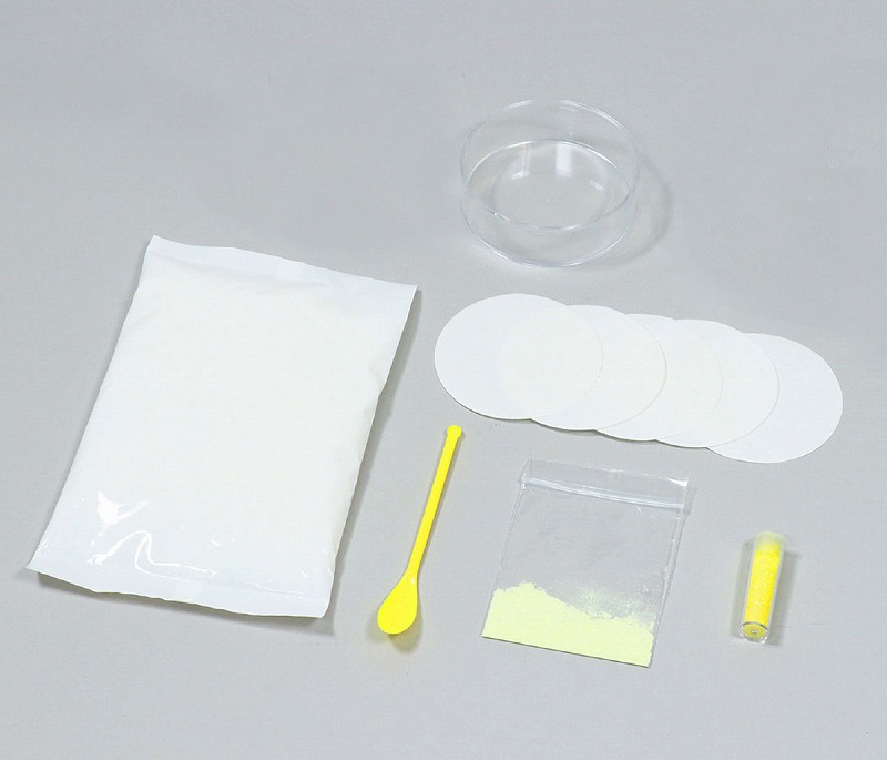 シャーレ:φ80×25mm、ろ紙:φ70mm、薬さじ:125×16×12mmシャーレ×1、尿素(120g)×1、ろ紙×5、薬さじ×1、蛍光粉(約3g)×1、キラキラ粉(2g)×1168gシャーレ:GPPS(汎用ポリスチレン)、薬さじ:ABSヘッダー付PP袋入180×240×30mm