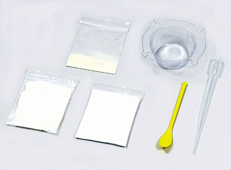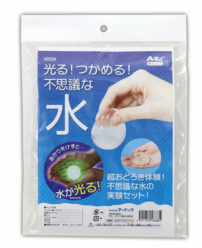 薬さじ:125×1アルギン酸ナトリウム(8g)×1、乳酸カルシウム(16g)×1、薬さじ×1、スポイト(2ml)×1、蛍光粉(約3g)×1、プラ皿×149g水が光る?!水がつかめる?!超おどろき体験!不思議な水の実験セット!薬さじ:ABS、プラ皿:PVCヘッダー付PP袋入180×245×163mm