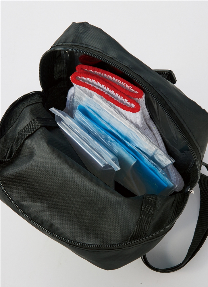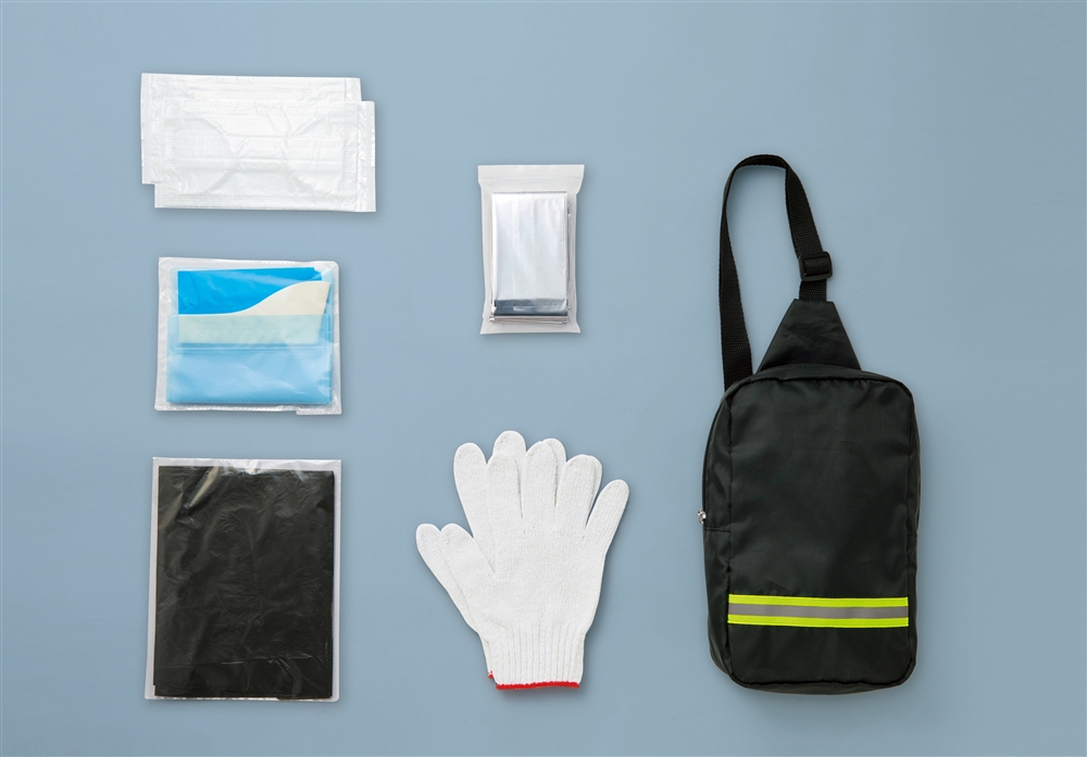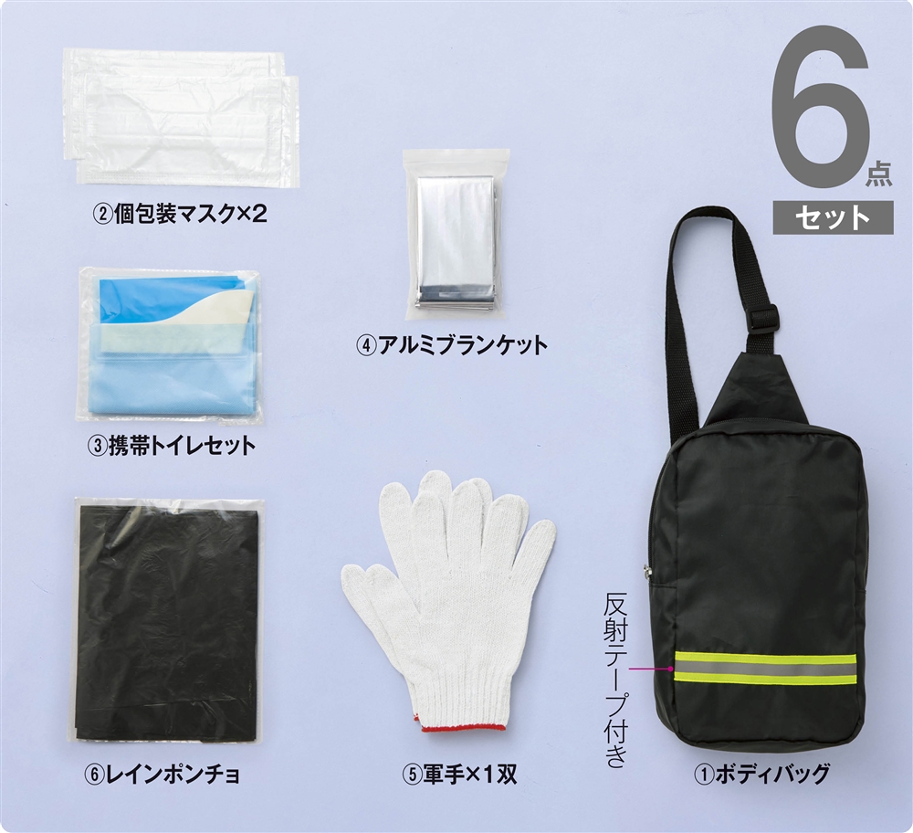 ボディバッグ/ポリエステル・ナイロン・ポリプロピレン 個包装マスク/不織布(ポリプロピレン)・ポリエチレン 携帯トイレセット/不織布(ポリプロピレン)・EVA・高吸水性ポリマー・ポリエチレン アルミブランケット/アルミ蒸着PETフィルム 軍手/綿・ポリエステル レインポンチョ/ポリエチレン