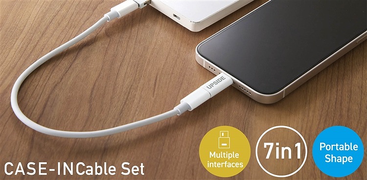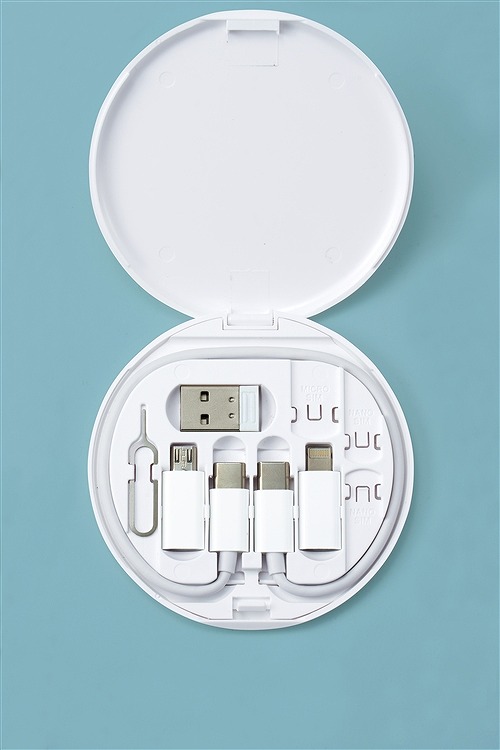 USB Type-Cケーブル、USB Type-Aコネクタ、microUSBコネクタ、Lightningコネクタ、SIM取り出しピンが含まれており、さまざまなデバイスに接続可能です。さらに、ケースを裏返せばスマホスタンドにも。携帯しやすく非常に便利です。フルカラーでの名入れ印刷にも対応しています。