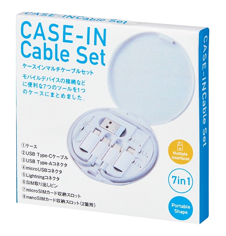 [セット内容] ケース(microSIMカード・nanoSIMカード収納ポケット付き)×1 USB Type-Cケーブル×1・USB Type-Aコネクタ×1 microUSBコネクタ×1・Lightningコネクタ×1・SIM取り出しピン×1