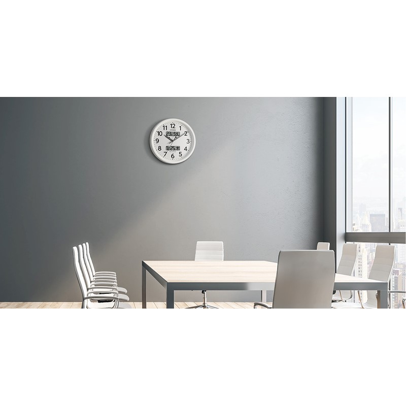 コチコチ音がしない連続秒針の液晶表示付電波掛時計です。 大きな文字板で、時間も温湿度もカレンダーも見やすくなっています。