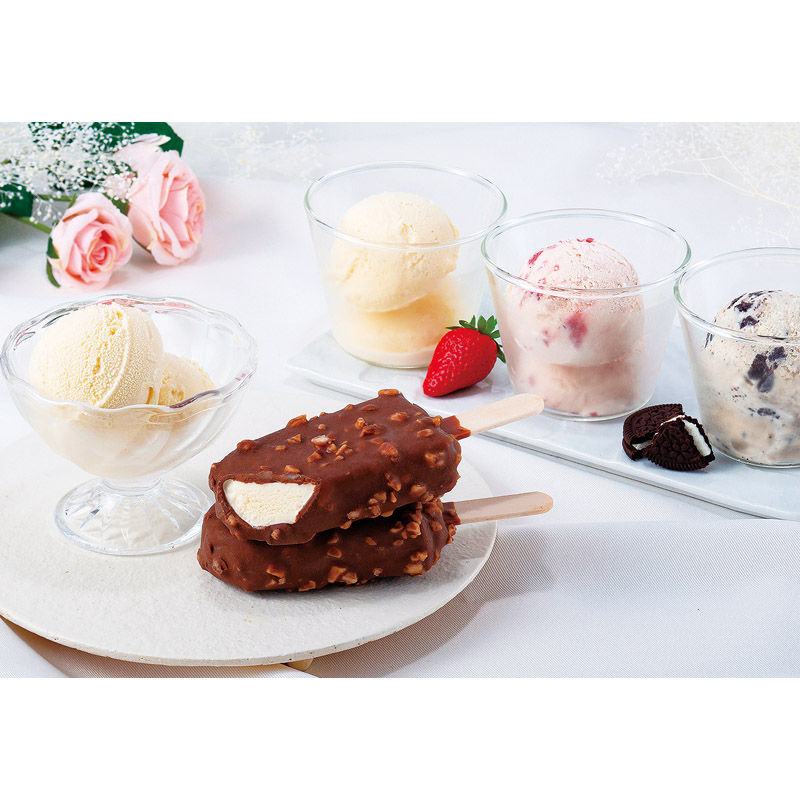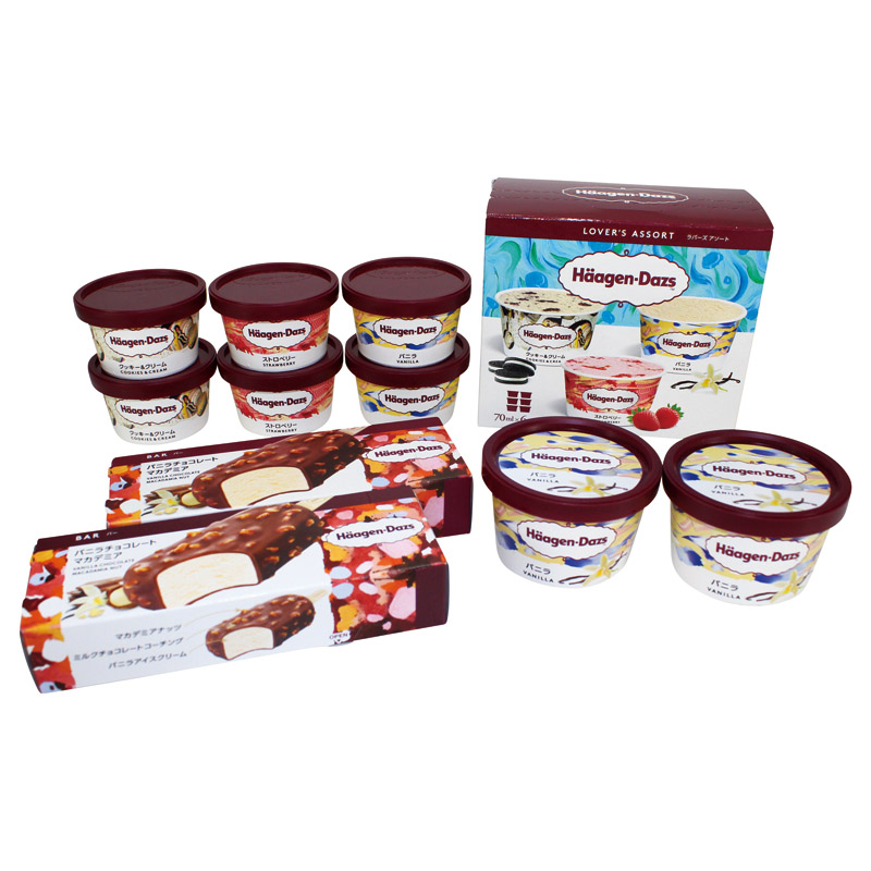 ミニカップ(バニラ)110ml・バー(バニラチョコレートマカデミア)80ml×各2、ラバーズアソート(バニラ・ストロベリー・クッキー&クリーム各70ml×2)×1
