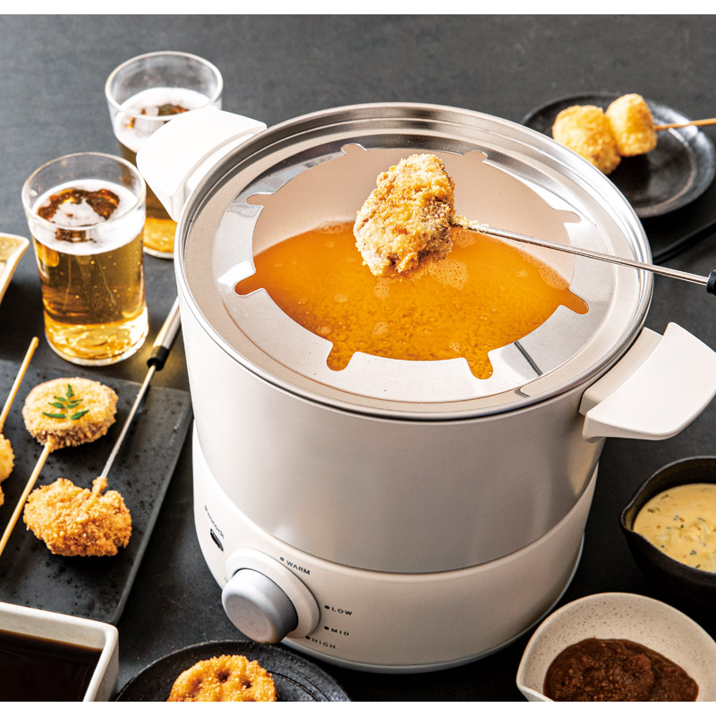 食卓を囲みみんなでできたての串揚げを楽しめるテーブルフライヤー。焦げ付きにくくお手入れがしやすいセラミックコーティング。油跳ねを軽減する保護カバー付き。レシピの載ったリーフレット付。