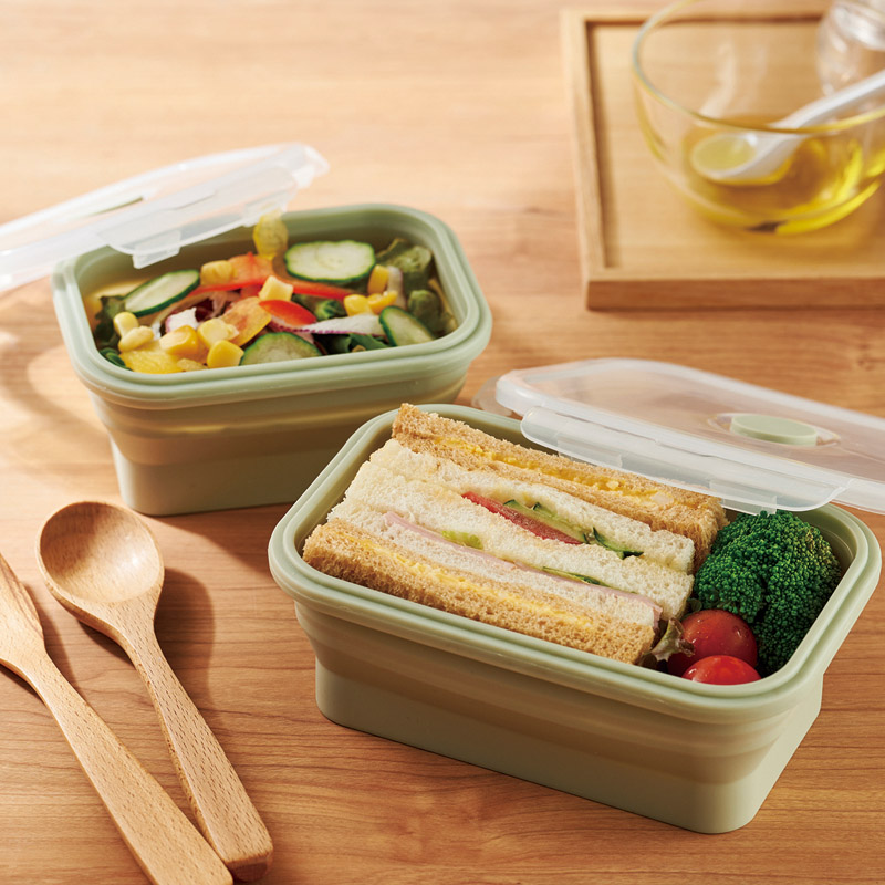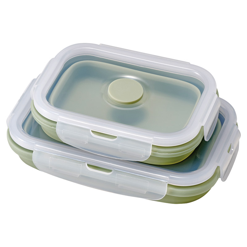 たたんでコンパクトに収納可能なシリコンタッパーセット。冷凍冷蔵、電子レンジ可と幅広くご使用頂け、アウトドアにも便利な保存容器です。