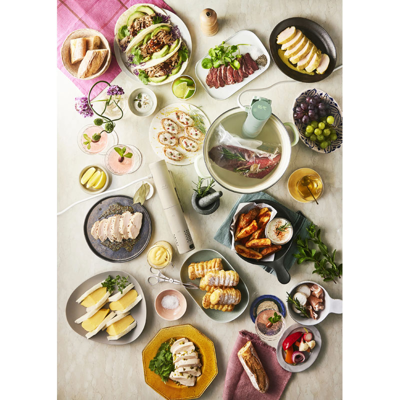 火加減が難しい肉や魚、卵料理でも、温度と時間を設定したらあとは待つだけ! ほったらかし調理でとろけるおいしさが愉しめる低温調理器。食材をじっくり低温加熱することで素材本来の旨味や栄養素 を逃さず、ヘルシー&理想のやわらかさに仕上げます。スライド式クリップで深型の鍋から浅型の鍋まで着脱可能。たっぷりつ くりたいときにも、少人数分をつくりたいときにも活躍します。毎日のごはんからスイーツ、おもてなしまで! 手間なく食材のおいしさを引き出し、いつもの料理をリッチな味わいにグレードアップしてくれます。