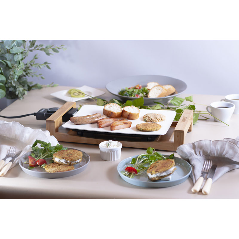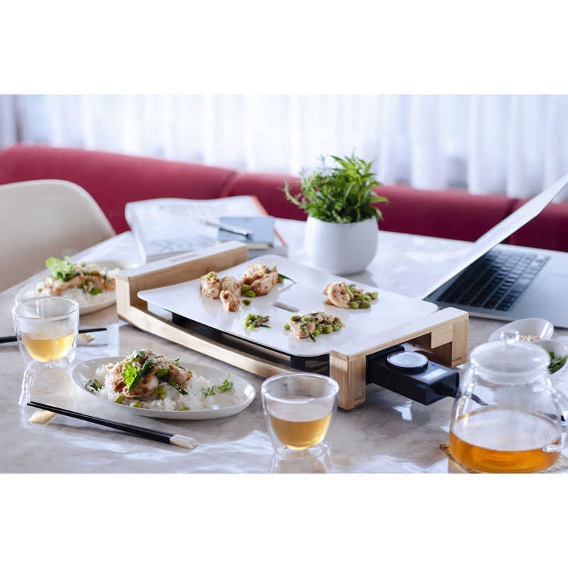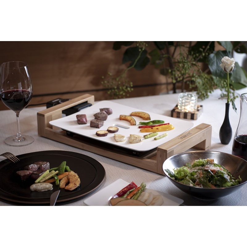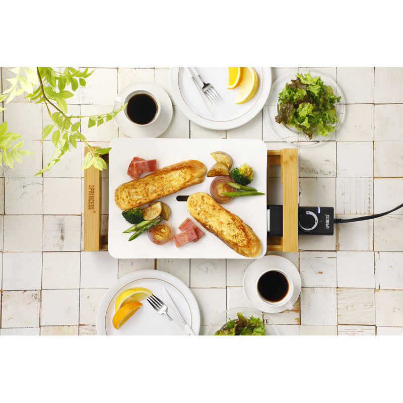天然竹と優美な曲線を描くプレートの組み合わせはまるで美しいインテリア。デザインの国、オランダが生んだ家電ブランドPRINCESSの代表アイテム、テーブルグリルピュアのミニサイズです。セラミックコーティングの遠赤外線効果と熱源直付けによる熱伝導、蓄熱性の高さは野菜、肉、海鮮など、あらゆる素材本来の美味しさを引きだします。中央のスリットが余分なオイルを逃してくれてヘルシー。軽い汚れはサッと一拭き、プレートは取り外して水洗いできお手入れも簡単です。