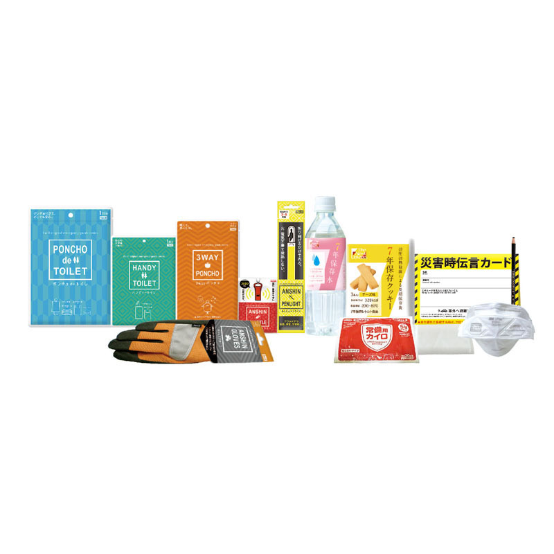 7年保存水(500ml)×1、7年保存クッキー チーズ味×1、使い捨て携帯トイレ(大小兼用)×1(250×180×15mm)、使い捨て携帯トイレ(小便用)×1、3WAYポンチョ×1、使い捨て簡易ライト×1、反射材付きグローブ×1、3M社製防じんマスク×1、緊急用ホイッスル×1、長期保存用カイロ×1、ポケットティッシュ×1、伝言カード×1、ペン×1
