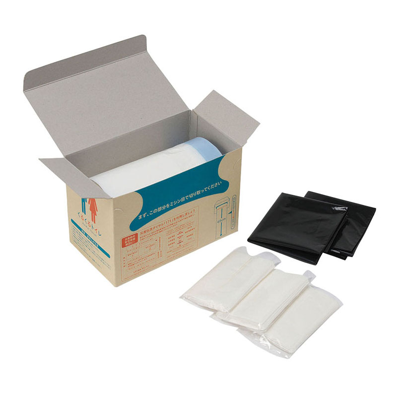 ●ロール状のトイレ袋をくるくると引き出して使用します。 ●吸水シート入りですぐにジェル化し始めます。 ●1枚500mLの水分を吸収。 ●紐付の袋で衛生面・臭いに配慮。 ●1箱に20枚入でコンパクトに備蓄可能。 ●裏面には災害時伝言ダイヤル利用方法を表示。 ●ポリ袋とポケットティッシュ付。