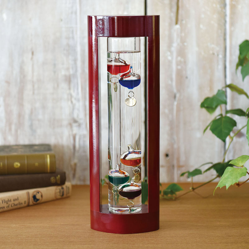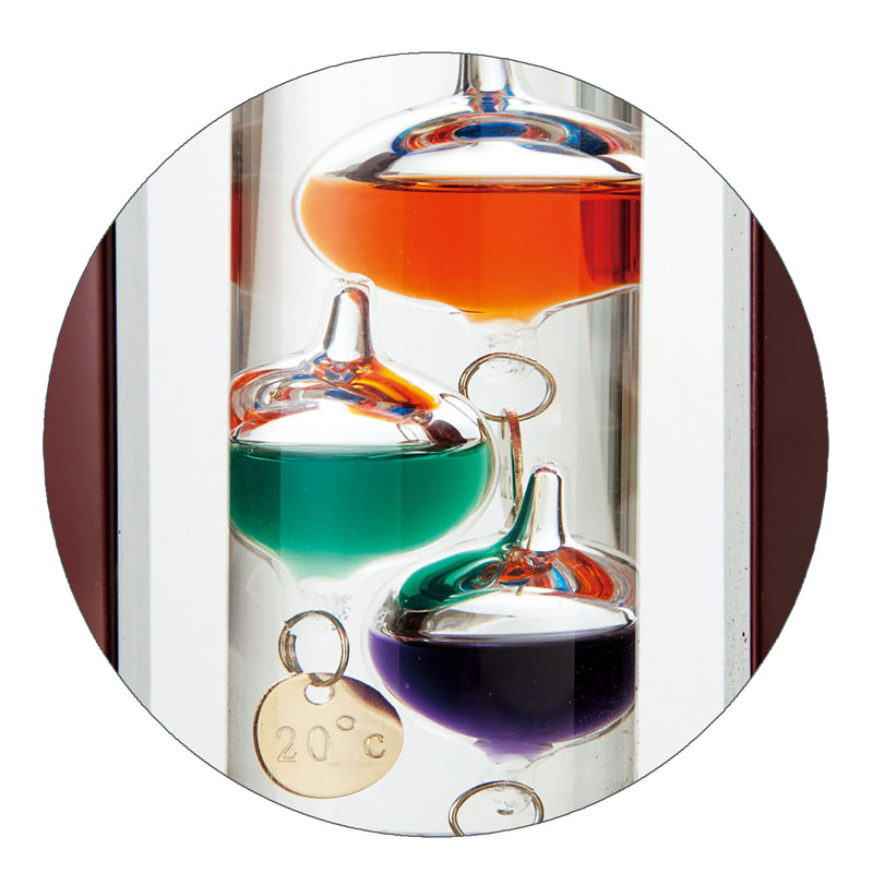 気温によって上下するガラスの球体が気温を示します。実際の気温は上層部に浮いているガラス球体に付いているプレートで読み取ります。測定可能範囲:18℃~26℃