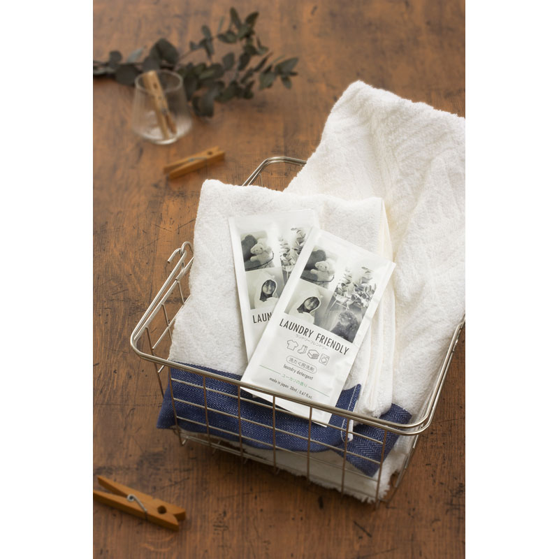 ハンドタオル×1(320×320mm) (材:綿100%)、洗たく用洗剤パウチ(20ml)×1