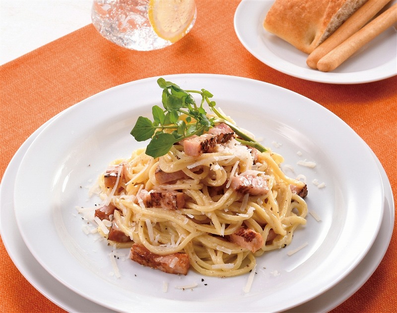 粉チーズを贅沢に使用したコクと、黒胡椒がアクセントになった濃厚なカルボナーラソースと麺のセット。