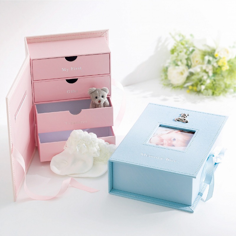 お子さまの大切な思い出を保管できるメモリアルボックスです。柔らかな色合いやオーナメント、特別感を演出するリボンなど細部までこだわったデザインで、成長したお子様に贈るのもおすすめ。表紙には写真を、4つの引き出しにはへその緒ケースや出産時のタグ、ファーストシューズ、おもちゃなどを自由に保管できます。