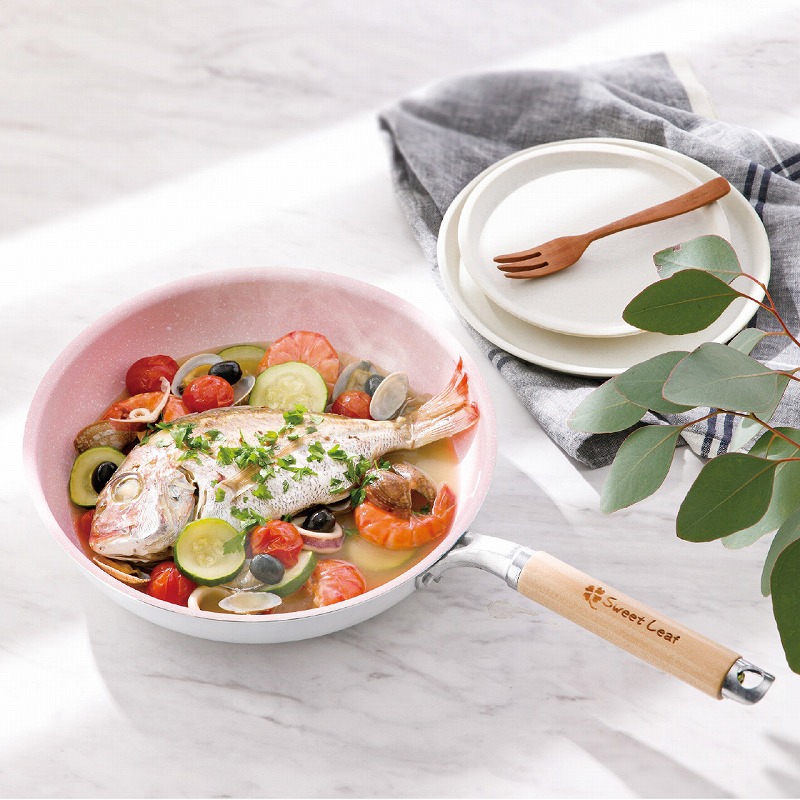 直径24cm深型フライパン1個・重量590g・本体:アルミニウム合金(内面:フッ素樹脂加工・外面:焼付塗装)・底面:ステンレス鋼・取っ手:天然木・[中国製]