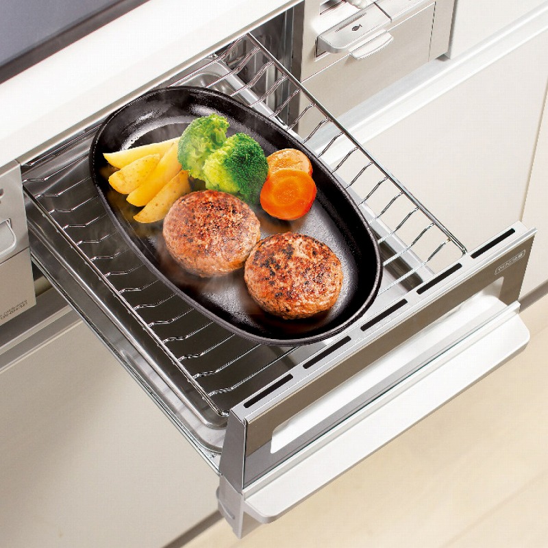 鉄鋳物は保温性が高く、熱ーが長続きします。ハンドルと敷板付で持ち運びに便利。IH、直火、オーブン対応