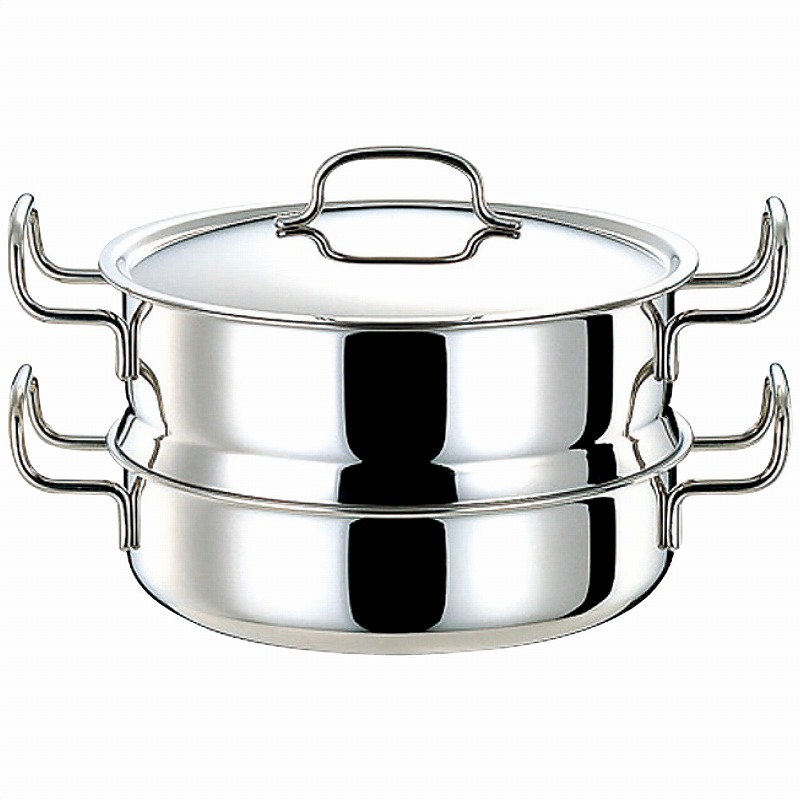 直径25cm浅型両手鍋(蓋付)1個・本体:全面7層構造(18-8ステンレス・アルミニウム・アルミニウム合金・有磁性ステンレス)・本体板厚:2.4mm・直径25cm蒸し器1個・18-8ステンレス・[日本製]