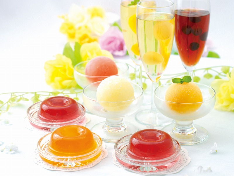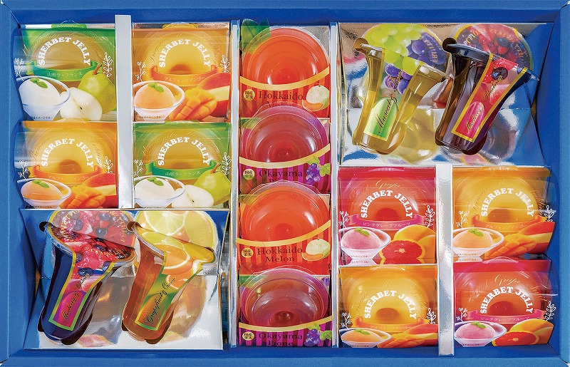 ミックスベリー&ブルーベリーゼリー 125g×2個、マスカット&ピオーネゼリー 125g×1個、グレープフルーツ&オレンジゼリー 125g×1個、シャーベットゼリーアルフォンソマンゴー 58g×4個、シャーベットゼリー山形ラ・フランス 58g×2個、シャーベットゼリーピンクグレープフルーツ 58g×2個、北海道赤肉メロンゼリー 58g×2個、岡山県産ピオーネゼリー 58g×2個
