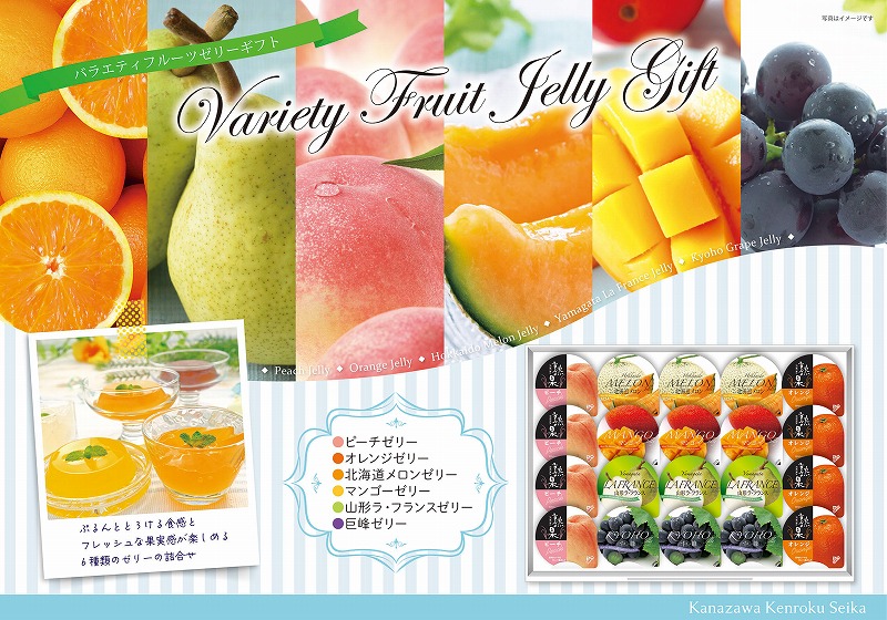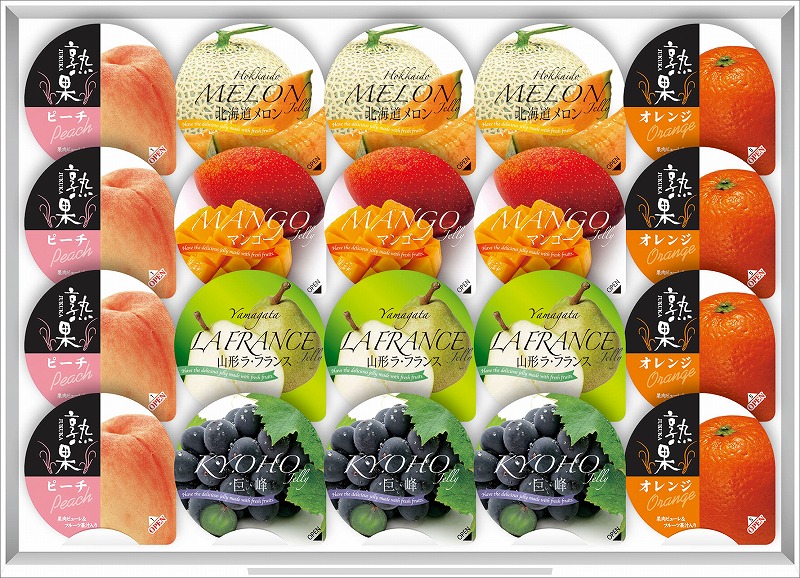 ピーチゼリー 52g×4個、オレンジゼリー 52g×4個、北海道メロンゼリー 52g×3個、山形ラ・フランスゼリー 52g×3個、マンゴーゼリー 52g×3個、巨峰ゼリー 52g×3個