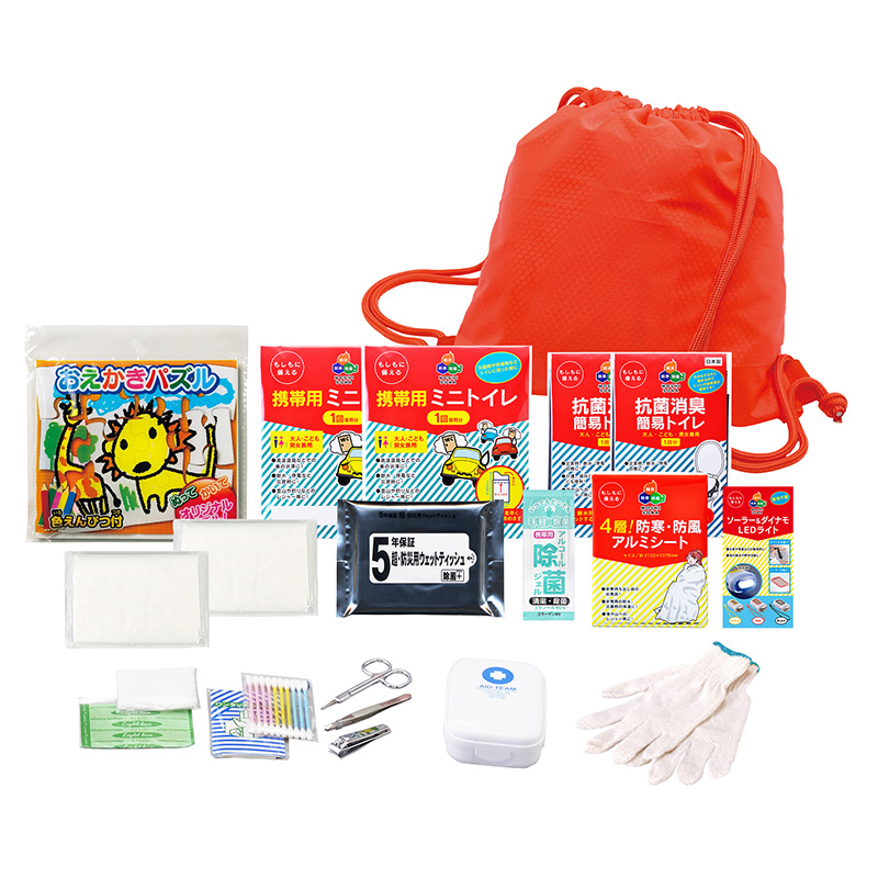 ●セット内容:小さめde巾着リュック、抗菌消臭・簡易トイレ×2、携帯用ミニトイレ×2、おえかきパズル、新ソラ&ダイナモLEDライト(3色アソト)、4層!アルミシト、除菌ジェル、防災用ウェットティッシュ(20枚入)、ポケットティッシュ×2、純綿こども軍手、絆創膏5枚、綿棒10P、コットンパフ3枚、ワンタッチ包帯、爪切り、毛抜き、ハサミ