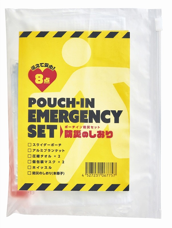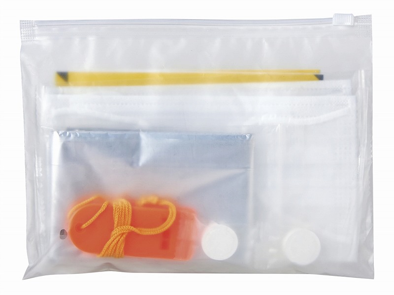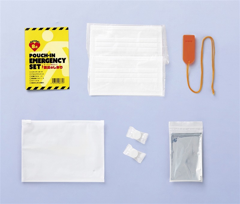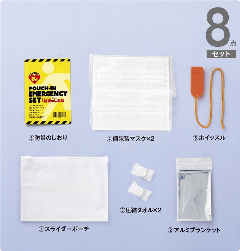 [セット内容] スライダーポーチ・アルミブランケット・圧縮タオル×2・個包装マスク×2・ホイッスル・防災のしおり