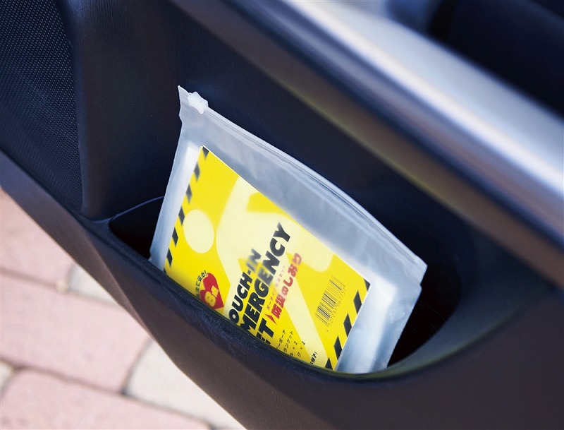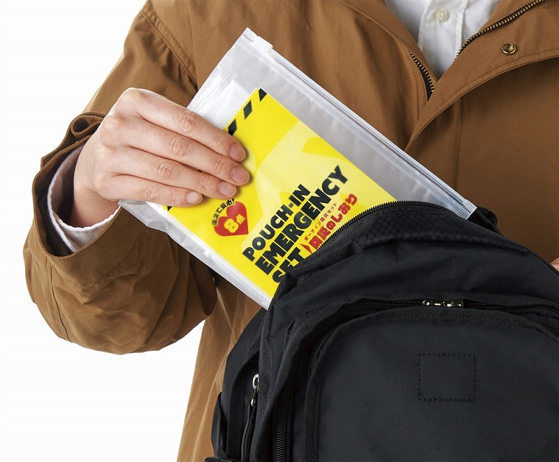 スライダーポーチ/約22×15cm アルミブランケット/約130×80cm 圧縮タオル/約24×22cm 個包装マスク/約17.5×9.5cm ホイッスル/2.8×6.9×0.8cm 防災のしおり/10.5×15cm